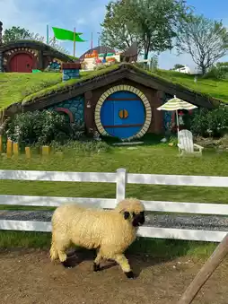 There's a Hobbit house at the entrance, and a coffee shop on the left.