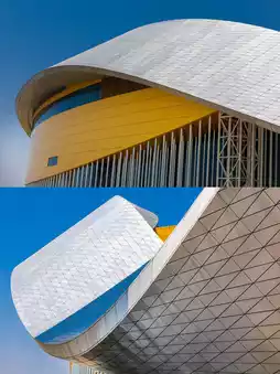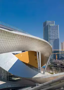• The Art of Structure and Mechanics: To achieve this unique curved shape, a complex steel truss structure was employed. Two high and low steel ribbons intertwine, with the high ribbon spanning 100 meters and the low ribbon stretching 370 meters, representing the longest span and length of steel ribbons in China. This innovative structural design not only ensures the building's stability but also endows it with a sculptural artistry.