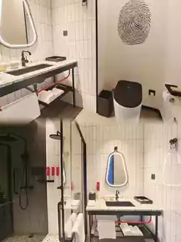 🛏 Rooms: The hotel has 79 rooms, and although they're not large in size, the layout is incredibly clever, with every inch of space utilized to the fullest! The rooms are colorful with stylish furniture and full of little surprises. The smart door access system provides a great sense of security, while the peg wall that replaces traditional closets is both practical and fun. The room storage hooks encoded with Suzhou numerals are perfect for trendy young people, and there's Moxy's signature folding table and chairs that you can arrange however you like. The 65-inch HD smart TV lets you watch movies anytime, and the walk-in shower washes away the day's fatigue. Lying on the comfortable bedding, you'll feel like you're about to have the sweetest dreams.