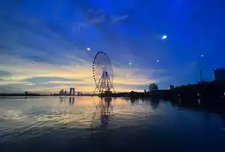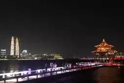 Jinji Lake offered a modern contrast. At 8 p.m. on Friday, the music fountain erupted—120-meter water jets swayed to *Jasmine Flower*, while lasers projected peony-patterned latticework onto the lake. On Li Gongdi’s viewing deck, the breeze carried the lake’s freshness.
