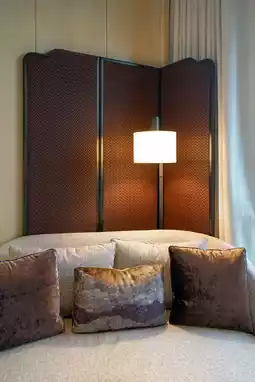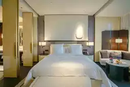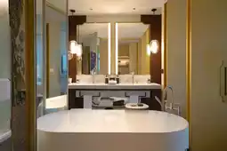 The rooms also embrace the neo-Chinese style with warm color tones. Many exquisite details stand out, such as the kintsugi blue-and-white porcelain screen that elegantly conceals the bathtub upon entry, and the delicate white porcelain decorations by the bed, exuding timeless elegance.
