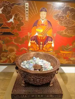 A notable feature within the house is the display of images and silver pots, where visitors are encouraged to drop coins in hopes of attaining wealth like the tycoon himself.