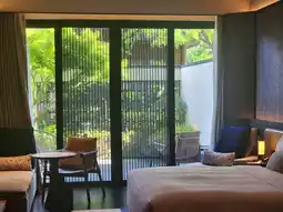Water View King Room: Floor-to-ceiling windows face the pool, reflecting blue sky, white clouds, and tree shadows inside the room. Lying on the bed watching the moonlight on the water is so romantic it inspires poetry.