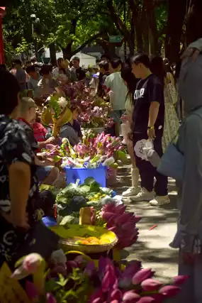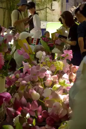 At the market, you can capture close-ups of dewdrops on lotus petals. After purchasing flowers, walk to Pingjiang Road and the Humble Administrator's Garden for stunning, ancient-style photos against the backdrop of white walls and black tiles. (More photos!)