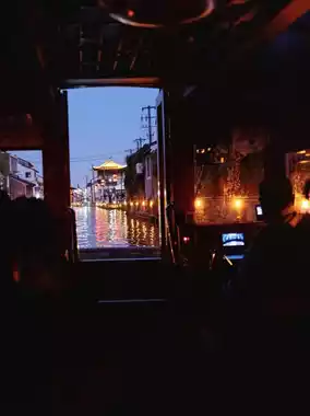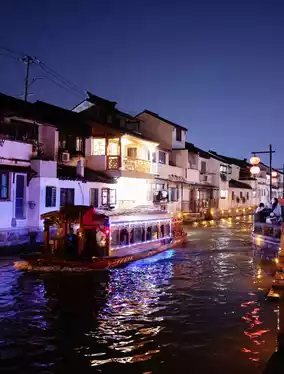 As dusk spread over the flying eaves of Shantang Street, I boarded a boat at the Bai Juyi Pier. The black-awning boat gleamed with a warm wooden glow, and the boatwoman, wearing a blue cloth headscarf, rowed gently. With each stroke, the ripples pushed the boat slowly into the depths of the river alleys, opening the page of Suzhou’s night.