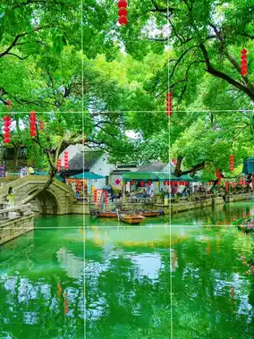 The camphor trees by the shore filter the sunlight into delicate gold flakes, gently falling on the river surface. The river flowing through the town is crystal clear, and the shadows of swimming fish are distinctly visible. The black-awning boats glide softly, creating ripples that spread in circles, and the sparkling light on the water sways and jumps as if someone has shattered stars and scattered them into the water. Even the reflections of the white walls and black tiles on both banks become flowing fragments of golden paintings, each glance filled with the poetic charm of Jiangnan.
