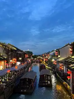 π Shantang Street, another old street in Suzhou, bustles at night with restaurants and street food vendors, offering dishes like Suzhou soup dumplings, char siu (pork cutlet), soy milk, and many other delicious local snacks. With the romantic atmosphere of the lights reflecting off the water, it's truly a sight to behold.