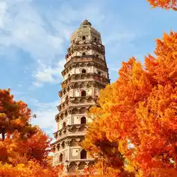4. Huchu Mountain: Ancient pagodas amidst fiery red maple leaves