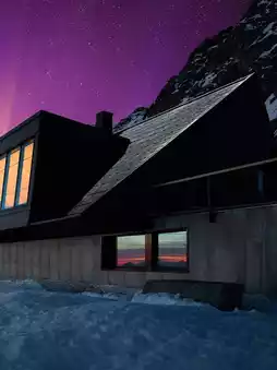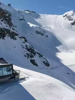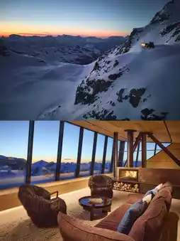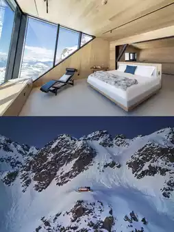 Cabane Tortin is a luxury resort in Verbier, Switzerland, perched alone on a polar glacier slope at an altitude of 3,000 meters, offering stunning views and a sense of tranquil solitude.