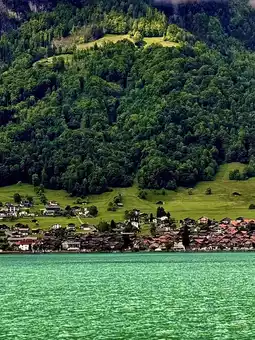 Lake Thun and Lake Brienz. The water is so clear that you can see the fish swimming around clearly ๐๐ฆ Swiss-style wooden houses are lined up everywhere, decorated with colorful fresh flowers in every house ๐ท