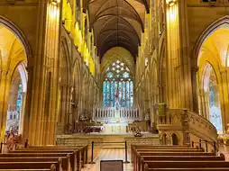 As Australia's largest and oldest Catholic church, the Cathedral of Our Lady (St. Mary's Cathedral) is located at the intersection of College Street and Prince Albert Road in Sydney's city center, across from Hyde Park. Construction began in 1821 and was rebuilt in 1928 after a fire. With its twin towers standing 74.6 meters tall, it has become a Sydney landmark. Its Gothic pointed arches, sandstone facade, and the colorful stone inlaid "Genesis" floor in the crypt evoke the legacy of medieval Europe.