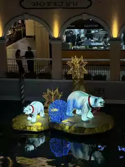 The main attraction is, of course, the iconic Venetian-inspired canal, which sparkles with twinkling lights and dazzling holiday decor. Gondolas glide serenely through the water, offering visitors a picturesque ride under arches adorned with Christmas ornaments. Imagine cruising along the canal while festive carols play softly in the background—it’s the perfect way to feel the holiday spirit.
