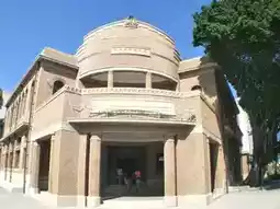 → The main entrance's dramatic cantilevered canopy at golden hour