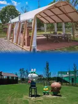 As soon as you enter the camping village, you feel like you've stepped into a LINE FRIENDS fairy tale world🧸. There are Brown🐻, Cony🐰, and Sally🐤 sculptures and elements everywhere, and they melt my heart💕. The village is surrounded by vast fields, with fresh air and beautiful scenery🌾, making you feel relaxed and happy.