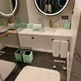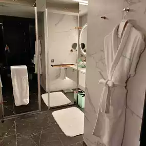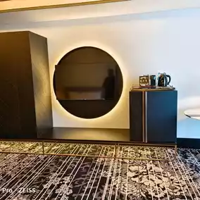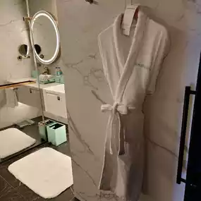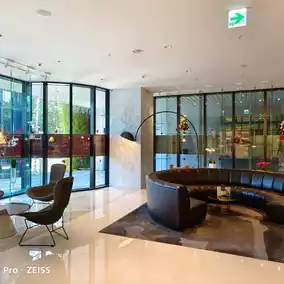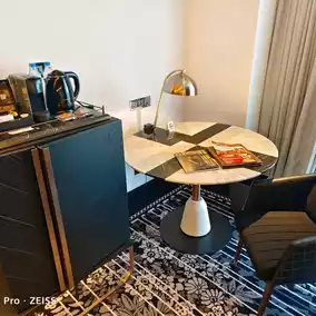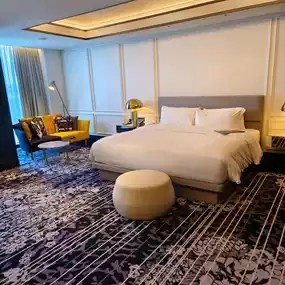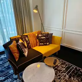 The low-key design reflects the European medieval chic, and the black, white and gray tones of the space are embellished with vibrant yellow sofas, lighting up the rest time after a busy day. Large floor-to-ceiling glass windows bring in natural light, allowing travelers to enjoy a leisurely and comfortable travel style in the 13-square-meter comfortable and bright space. Connecting rooms are available.
