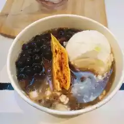 Taiwanese dessert douhua comes in a variety of flavors. The photo shows douhua topped with brown sugar tapioca, vanilla ice cream, and dalgona.