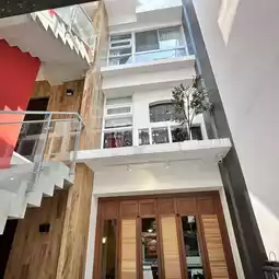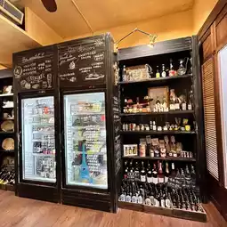 The high-ceilinged white building features a grocery and food display area on the first floor, along with an open kitchen and a limited number of seats. The second floor offers French country-style seating, and the third floor is currently closed.