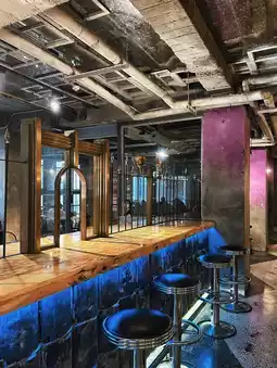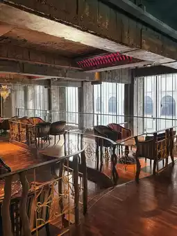 The old reinforced concrete exterior is deliberately preserved to reveal the building structure, cement and bricks.