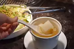 There are two types of salads: "Fried Sesame Oil and Vinegar Salad (Vegetarian)" and "Japanese-style Salad with Soy Sauce and Yuzu". I had the Japanese-style salad with lettuce, cucumber, tomato, etc. I thought the salad dressing was sufficient and both sour and sweet and quite appetizing. There are also two types of soup bowls to choose from, "Pineapple Bitter Melon Soup" and "Gastrodia Cashew Soup". The combination of the two looks very special and not the soup you usually drink. I chose the Gastrodia elata cashew soup, which tastes light and smooth.