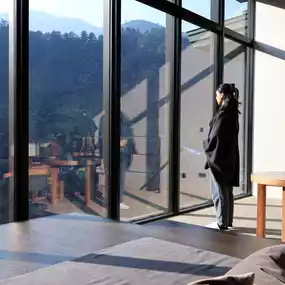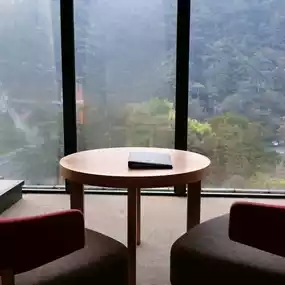 Upon entering the main room, it's hard not to be amazed by the view that catches your eye. One entire wall of the room is a floor-to-ceiling window that stretches from the ceiling to the ground. Looking outside, the full view of Hoshino Resorts KAI Gujo is in sight, with the misty peaks of Malun Mountain in the distance.