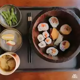 it is a set meal of flower sushi, miso soup, fruit and edamame.