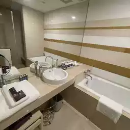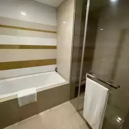 The toilet and bathroom in the room are separated, the space is large and comfortable, there is a dehumidifier in the room, and the main switch can play music directly (the speakers are embedded directly in the ceiling), which gives it a sense of luxury! The bed was the right hardness, the quilt was a little warm, and the toilet bidet was great.