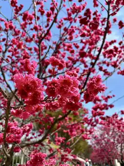 The spring breeze is slightly cool as I travel along the winding mountain road to Wuling Farm in Taichung. It's the peak of cherry blossom season, and the entire valley seems to be covered in a layer of pink and white clouds. From a distance, the mountains are adorned with layers of pale pink cherry blossoms swaying gracefully under the blue sky, creating a stunning contrast with the lush green pines and cypresses. This picturesque spring scene is like a beautiful painting. Walking along the cherry blossom trail, a gentle breeze blows, causing the petals to fall like snowflakes, covering the path. It feels like being in a dream. Travelers stop to take photos or sit quietly under the trees, soaking in the tranquility and poetry that nature offers. I slowly make my way to Taoshan Waterfall, where the flowing water reflects the cherry blossoms, sparkling like a moving spring. In the afternoon, sunlight filters through the flowers, casting colorful shadows, and a few birds fly over the treetops, adding a touch of liveliness to this serene pink world. As the mountain mist rises, it envelops the cherry blossoms in a hazy veil, resembling an ink painting of a spring scene. The afterglow of the sunset illuminates the sea of flowers, and as I look back at this cherry blossom paradise, my heart is filled with the lingering charm and reluctance of spring.