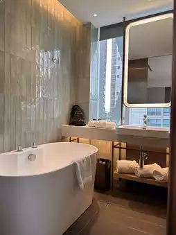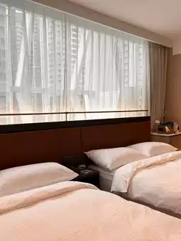 This was a light trip with family. We chose "Caiyu" because it is a hotel under the Evergreen Group. Since there were three of us, we opted for a room with two double beds. The bathroom and toilet were separate, and the bathroom even had a bathtub for soaking.