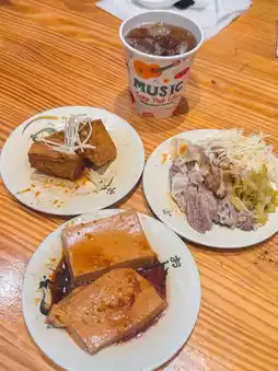 There are four side dishes to choose from, and we ordered one each of dry braised tofu and fried tofu. The braised tofu with a solid texture is very flavorful; the fried tofu is crispy on the outside and tender on the inside, and I personally prefer the braised tofu. We also ordered a portion of dry compartment meat/liver & soup with vegetables. The compartment meat is chewy, and the vegetables are flavored with braised meat, which makes it more salty and fragrant.