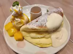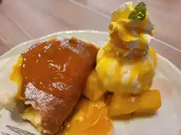 Mango Ice Cream Pancakes: Crispy on the outside, soft on the inside, thick pancakes paired with rich ice cream and honey for a sweet yet refreshing treat;