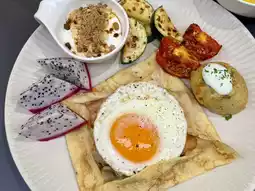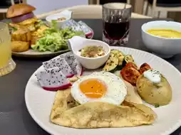 I stayed at the Red Dot Hotel, which recently won the if Design Award, again. I was lucky enough to find a new menu when I checked in. I was about to get tired of the same old four dishes, but they were just as delicious as always. It's definitely worth staying here just for the food. This time, I chose B and C. The burger was a thick steak with a slightly spicy taste, which was very appetizing. The French crepe with spinach, bacon, and cheese was a savory crepe that was quite good. Paired with a sunny-side-up egg, it was the perfect breakfast! A great start to the day.