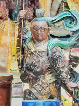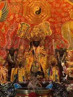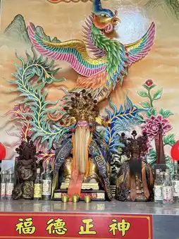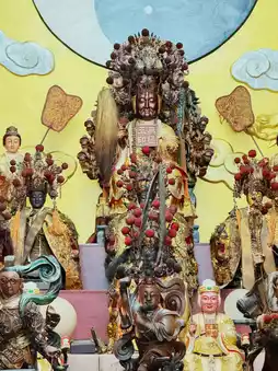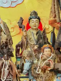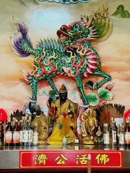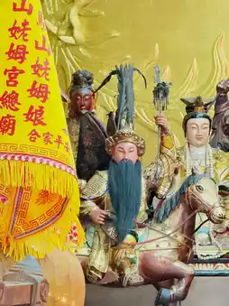 A banner hung high in the temple, its yellow background in red lettering. The four characters "Mount Li Lamu" stood out with powerful clarity, their golden glow radiating the firmness and wisdom of a mother. A statue stood beside, solemn, its brows brimming with awe, yet a subtle, protective compassionate gaze radiating from its face.
