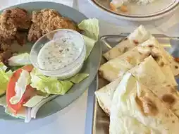 The Indian Curry Fried Chicken had a crispy exterior and juicy, tender interior. It was served with a few salad leaves, lemon, and a tangy cucumber-flavored dressing, which helped cut through the greasiness.