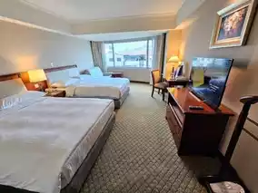 As expected of a star-rated hotel, the price is on the higher side. The deluxe double room is approximately 6 pings in size, featuring somewhat old-fashioned decor but still comfortable and clean. A weekday stay for two, including breakfast, costs NT$3,856. The breakfast quality is decent.