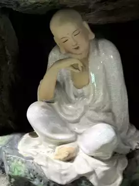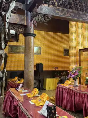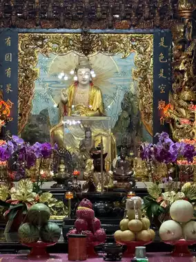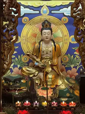 Entering the main gate, one is surrounded by pine and cypress trees, with swaying bamboo shadows, highlighting the temple's ancient and solemn beauty. Within the hall, Guanyin's image is dignified and benevolent, her majestic appearance imposing. Holding a pure vase and a willow branch, she seems to sprinkle nectar upon the mortal world, cleansing the cares of believers.