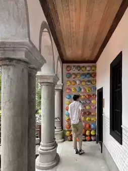 Bright and colorful lanterns perched atop the old stone pillars evoke a sense of time and space, while also adding a warm ambiance. During the day, sunlight gently filters through the wooden ceiling, and the harmonious colors of the lanterns on the walls create a visual feast. It's the perfect space for a stroll or a photo shoot.