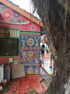 Stroll down the labyrinth of painted lanes—arrive early to beat the crowds and the midday sun. Start at the main entrance for that iconic mural shot, then wander deeper for quieter, quirky corners. Don’t miss the painted benches and doorways—they’re perfect for solo or group photos! The best insta-worthy angle? Snap a panoramic shot along the narrow laneway where walls, floor, and even the ceiling are covered in cheery art.