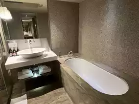 The room was a good size, perfect for luggage and everything. It also had a bathtub. The double bed was a king-size bed, perfect for sleeping comfortably.