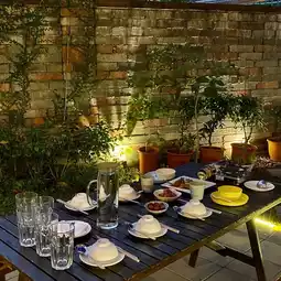 The dining area has basic seating for 4 people, as well as seating for multiple people. There is also a garden seating area outside, which is even more cozy when the lights are turned on at night.