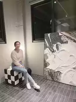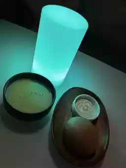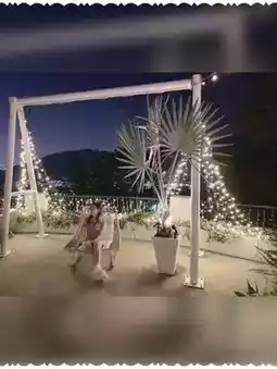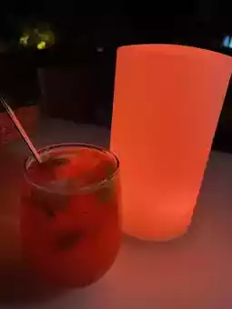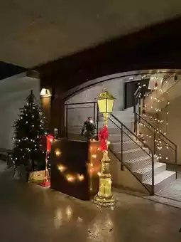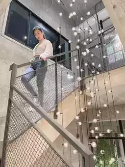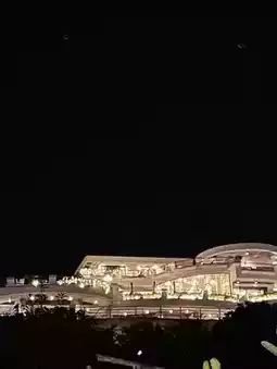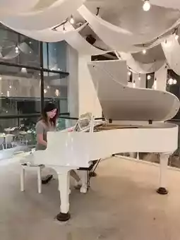 There are green plants in many places in the building. The neon lights, light strings and white buildings are really beautiful under the lights and are great for taking pictures! There is also a white grand piano inside where you can take photos!