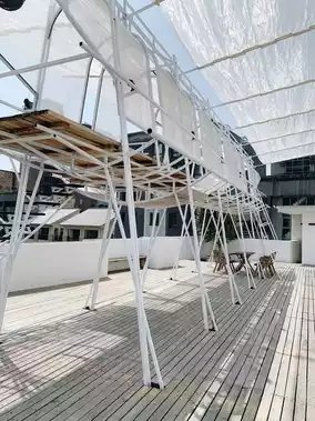 I didn’t plan too many things to do in Taichung this time. I just wanted to relax, so I spent a lot of time wandering around the B&B. I found an art installation on the roof, called “Imaginations Rising with the Wind”🚢, created by students from the Institute of Architecture and Art at Tainan National University of the Arts. They imagined the roof as a port in the sky, a large white ship, moored, entering the port, and then resting. The blue sky behind is its sea, flying with the wind. 🌊