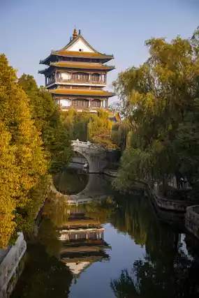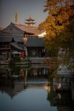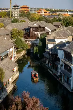 The sun shines on the surface of the ancient canal, sparkling like scattered gold powder.