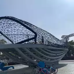 After visiting Eternal Golden City, while returning to the city, I happened to see a whale on the street. 🐳 The beautiful sky and the whale made it seem like you were soaring in the ocean. Once inside the whale, the stained glass, reflecting the sun, sparkled on the ground. Looking up, the stained glass was shaped like a Taiwanese sweet potato, with its mouth facing the harbor—so cute!