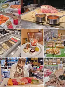There is also a small dining room with tables and chairs, and a kitchen counter next to it.