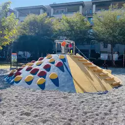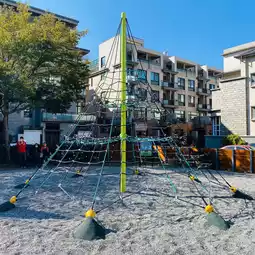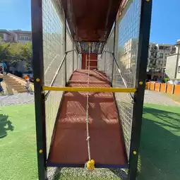 There were not many people playing on the climbing net, but there were wooden swings... The weather was very good when we went there, so it was a bit hot and sunny.