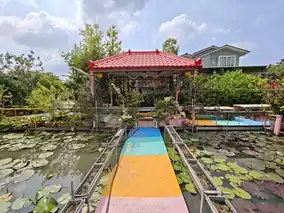 The park's owners have cleverly arranged a curved bridge and art installations around the lotus pond, complemented by blooming flowers such as bougainvillea and dendrobium, creating a picturesque scene known as the "Monet Garden of Taiwan." Adhering to the principle of promoting ecological education, the park offers no admission fee, allowing the public to experience the beauty of the lotus flowers. Jiupin Lotus Park has successfully expanded its lotus industry from agriculture (a primary industry) to catering, cultural and creative industries, and technology (a secondary industry), offering visitors a rich variety of experiences: