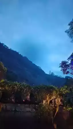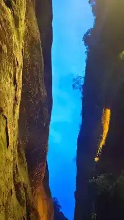 After getting off the raft, we heard that we could take a night tour of Jiulongtan. Jiulongtan is part of the most dense and complex Chinese Danxia canyon group, a typical area of the development of the Danxia landform during the youth period of Taining, integrating lakes, streams, mountains, valleys, rocks, peaks, and gullies with diverse changes, known as the 'miniature pearl of Taining Danxia landscape'. Jiulongtan is also the spot we have been longing to visit. We thought we wouldn't have time to play, but it turns out that we can also take a night tour, which is a pleasant surprise, allowing us to experience the Danxia peaks under the light and shadow.