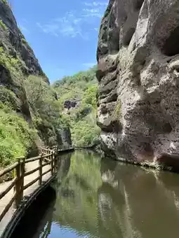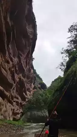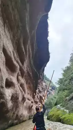 Shangqingxi is located in a deep mountain canyon area, with a large drop in the river, rapid water flow, more than ten meters wide at its widest and less than two meters at its narrowest, leaving only a slit of sky and just enough room for a single raft to pass through. The geology here is composed of ancient continental sedimentary rocks, and the Danxia landform formed by the red stone group is varied and spectacular, with strange peaks and caves, and sheer cliffs everywhere.
