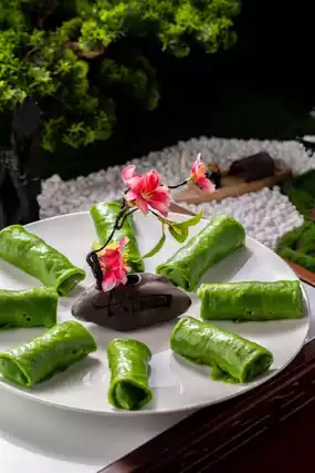📝Fun Fact: Floating soy milk is a process where a special gourd is used to hold aged soy milk and slowly float it over the freshly cooked soy milk. The small amount of aged soy milk that overflows slowly seeps into the fresh soy milk. 4️⃣ Handmade Jade Spring Rolls