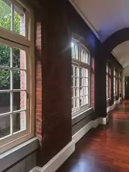 The contemporary art museum has a red brick surface and wooden roof trusses.